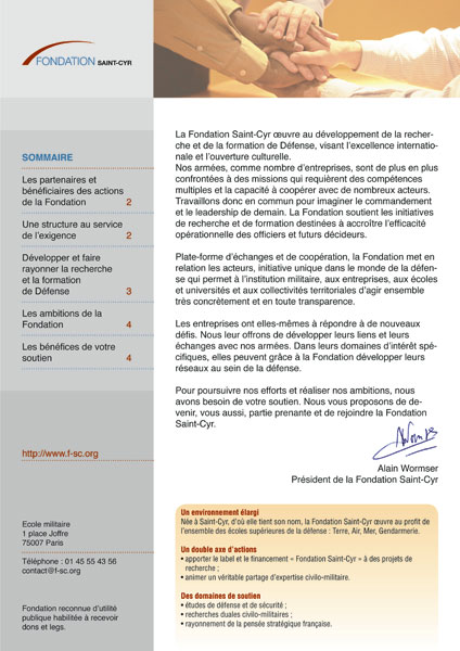Réalisation des rapports annuels de 2007 à 2009 pour la Fondation Saint-Cyr, organisme civil et militaire aux missions variées.